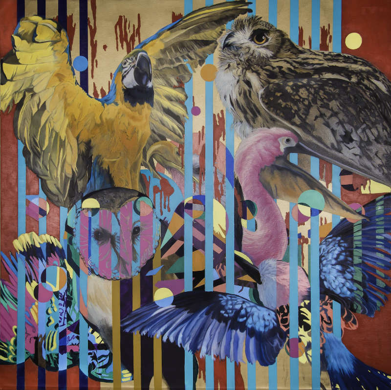 Here is the most recent work, Aviary, a combination of all the sketches that I did during my research. You can see that some characters form other works on display are present here: the owl, the parrot, the kookaburra. I wanted to do an all-encompassing peace with all the birds.